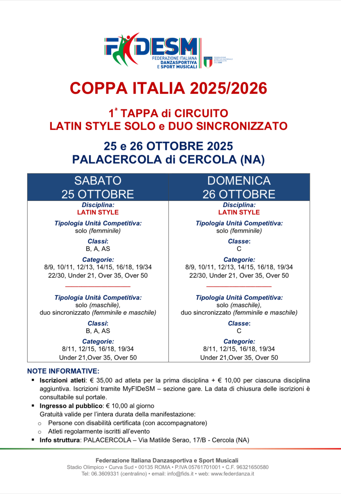 Il Consiglio Federale ha approvato il regolamento del Circuito della Coppa Italia Latin Style indetto per gli atleti delle categorie e classi previste dal vigente Regolamento del Dipartimento Danzasportiva e Sport Musicali per tutti.